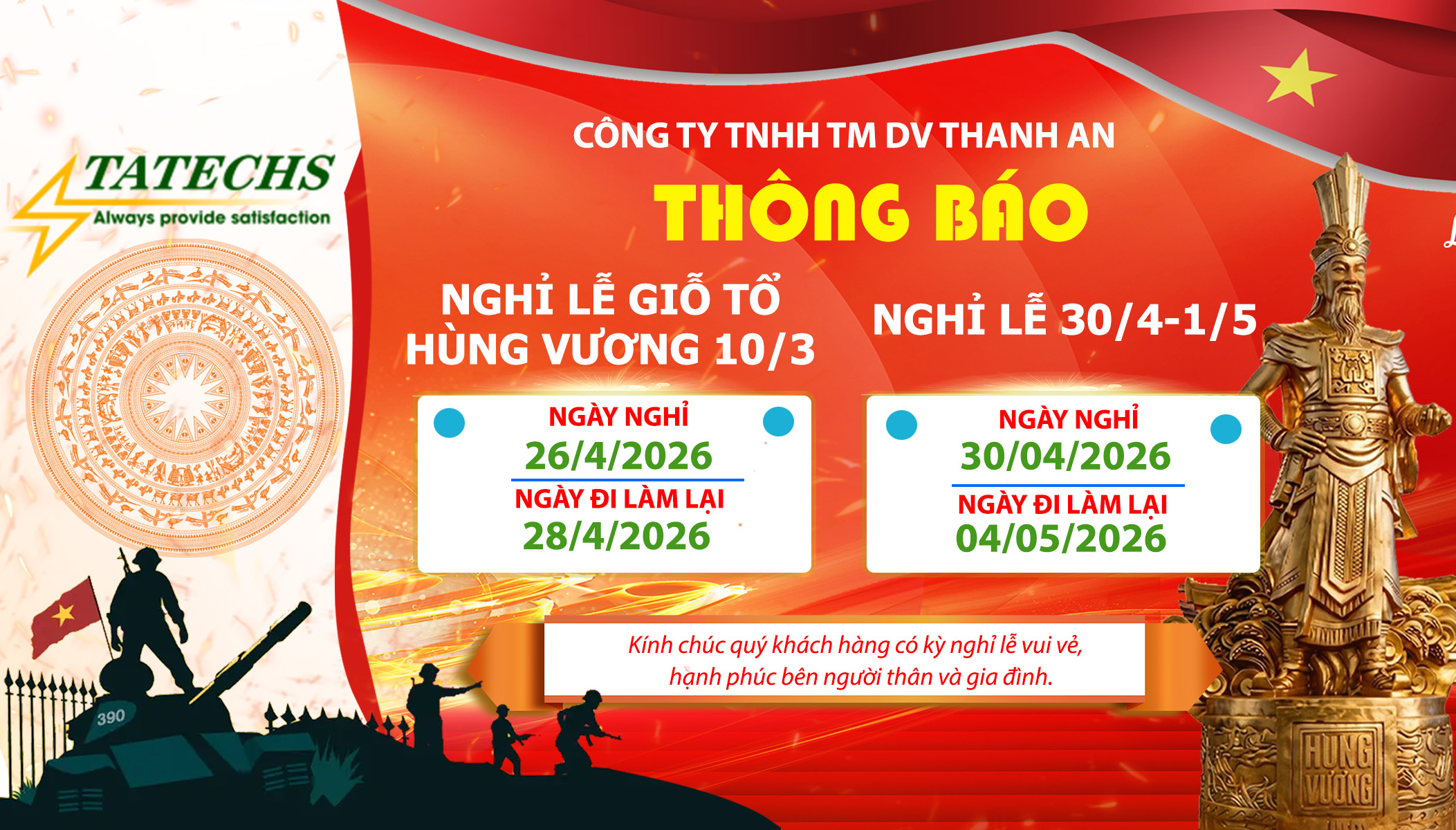 Hòa chung không khí phấn khởi của các ngày đại lễ trong tháng 4 và tháng 5, Công ty Thanh An (TATECHS) xin trân trọng gửi lời chúc sức khỏe, hạnh phúc và một kỳ nghỉ lễ thật ý nghĩa đến Quý Khách hàng và Quý Đối tác.
