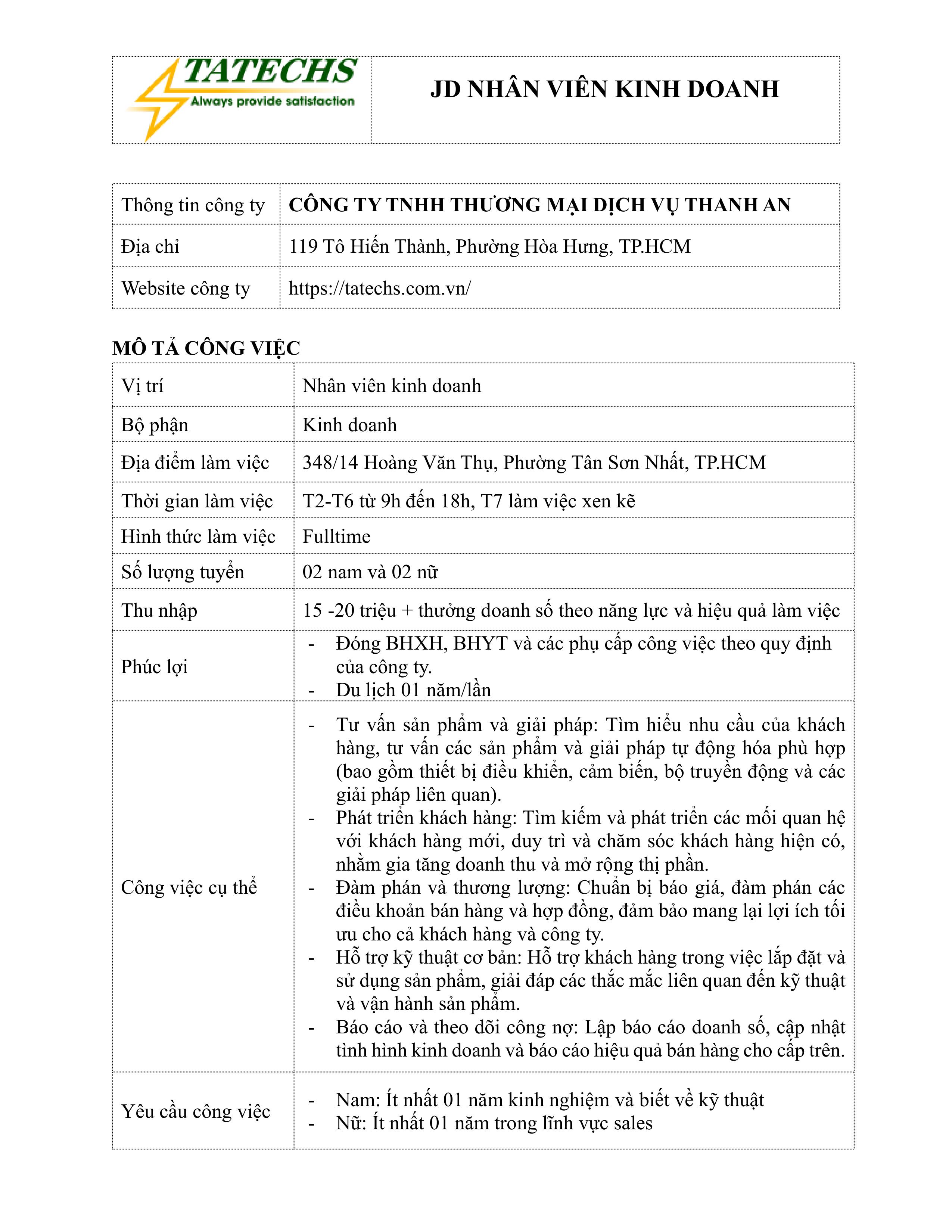 THÔNG BÁO TATECHS TUYỂN DỤNG NHÂN VIÊN KINH DOANH GIẢI PHÁP TỰ ĐỘNG HÓA TỰ ĐỘNG HÓA